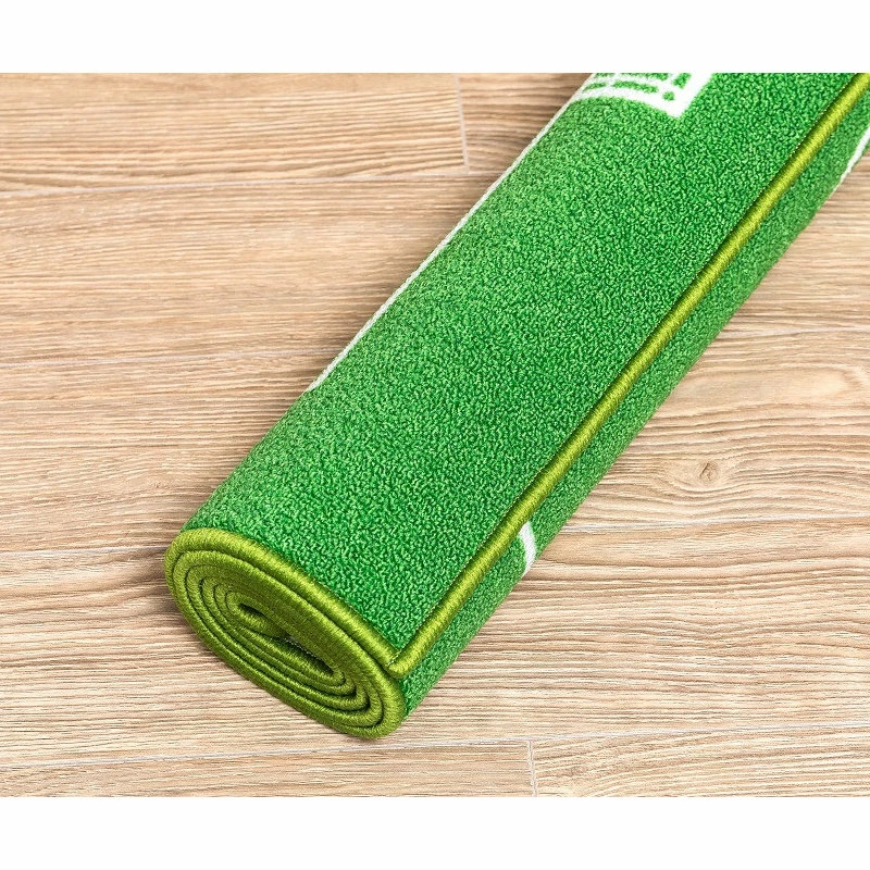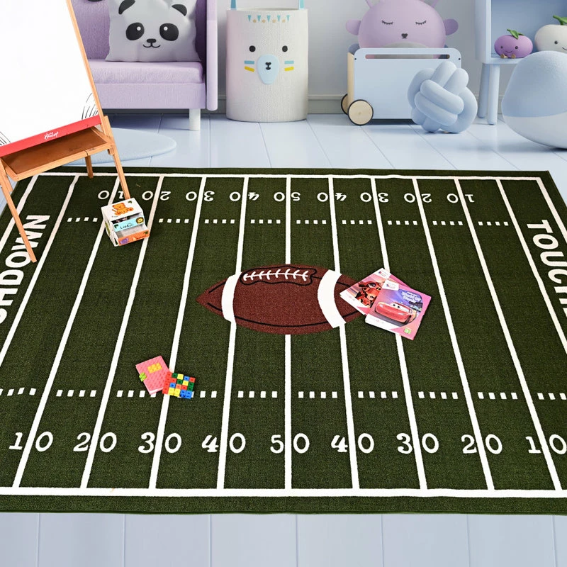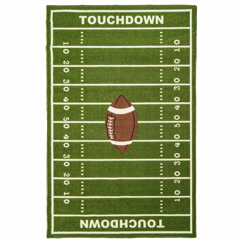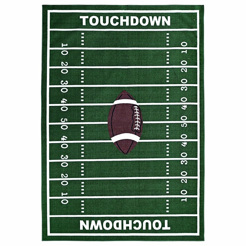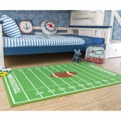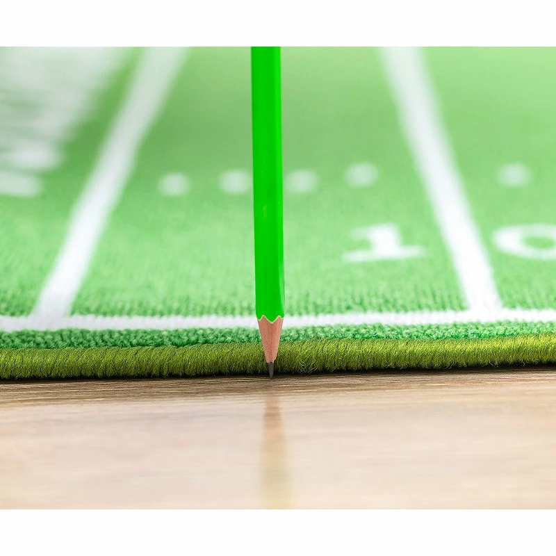- Minimalistic Design: Featuring a vibrant image of a football ground, this contemporary area rug brings a splash of sporty vibe to the spaces. The green colored base with white markings creates a striking contrast, enhances the overall aesthetic appeal of the rug.