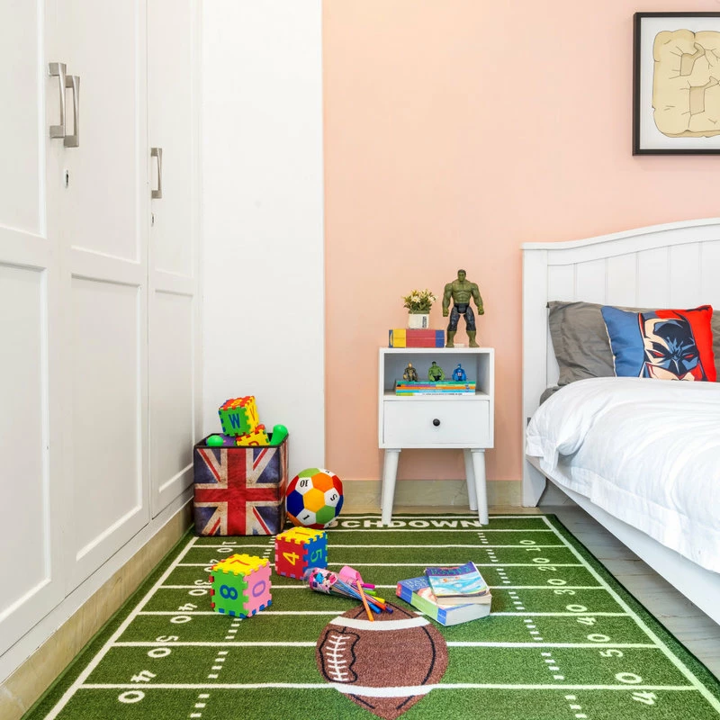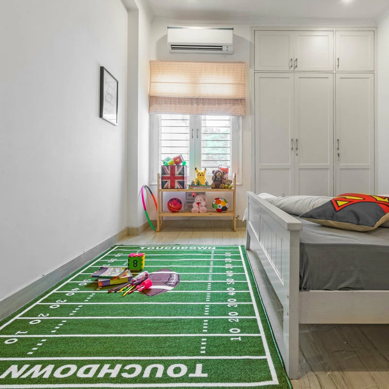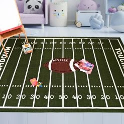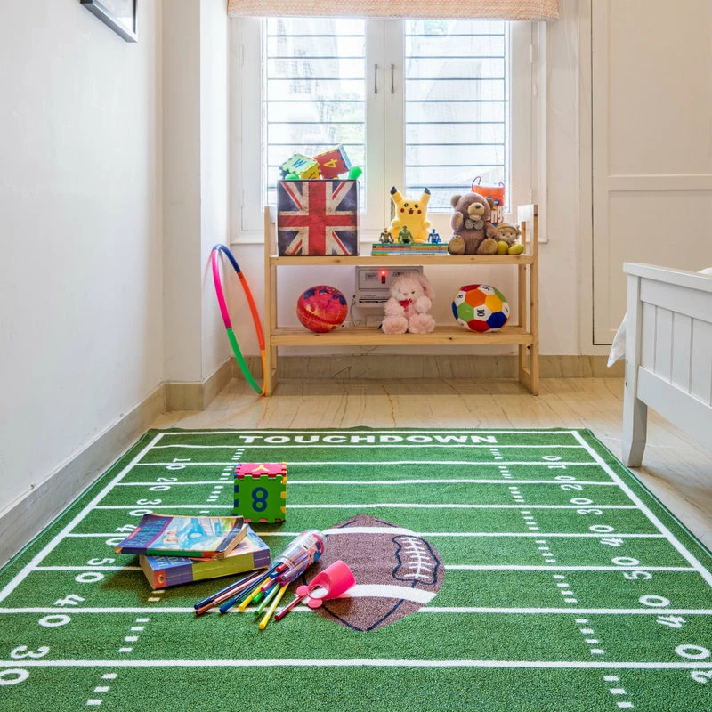 Contemporary Area Rug: Designed to bring a cheerful element to interior themes, this floor carpet is a statement addition for your kid’s bedroom, play area, nurseries, kindergarten or daycare center. Materials Used: The kids play area rug is made with a durable nylon fabric that responds better to normal wear and tear. It has a non-skid rubber backing that prevents folding of rug, minimizing the risk of accidental falling. Minimalistic Design: Featuring a vibrant image of a football ground, this contemporary area rug brings a splash of sporty vibe to the spaces. The green colored base with white markings creates a striking contrast, enhances the overall aesthetic appeal of the rug. Easy Maintenance: The rectangular floor rug demands negligible care. It can be spot cleaned with cold water and mild soap. This woven area rug can be easily folded and kept aside when you need to utilize the given space.