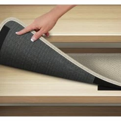 Each stair tread comes with four adhesive-backed hooked-fiber strips that adhere to your step and four looped-fiber strips sewn into the back of each tread that attach to the hooked-fiber strips