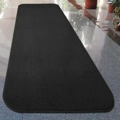 House Home & More Skid-Resistant Carpet Runner works great on carpet, tile, wood floors, as well as other hard-floor surfaces! These runners feature a premium, skid-resistant rubber backing to help create a safe, slip-resistant surface for you and your family including your dog or other pets. Made of high-quality olefin carpet to resist stains. Each carpet runner is bound on all edges to prevent fraying. Low pile-height allows for easy door clearance. These runners are easy to clean. They can be vacuumed without bunching up and can also be spot cleaned. Due to the skid-resistant rubber backing these carpet runners are not machine washable. These carpet runners feature a premium, skid-resistant rubber backing to create a slip-resistant surface for your family and pets