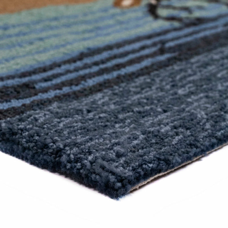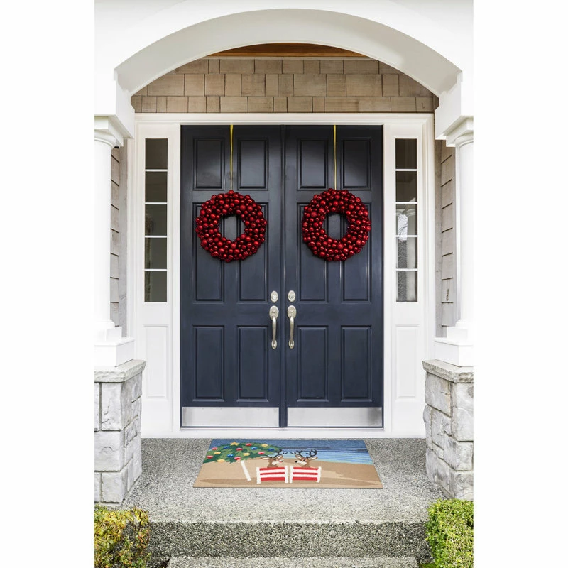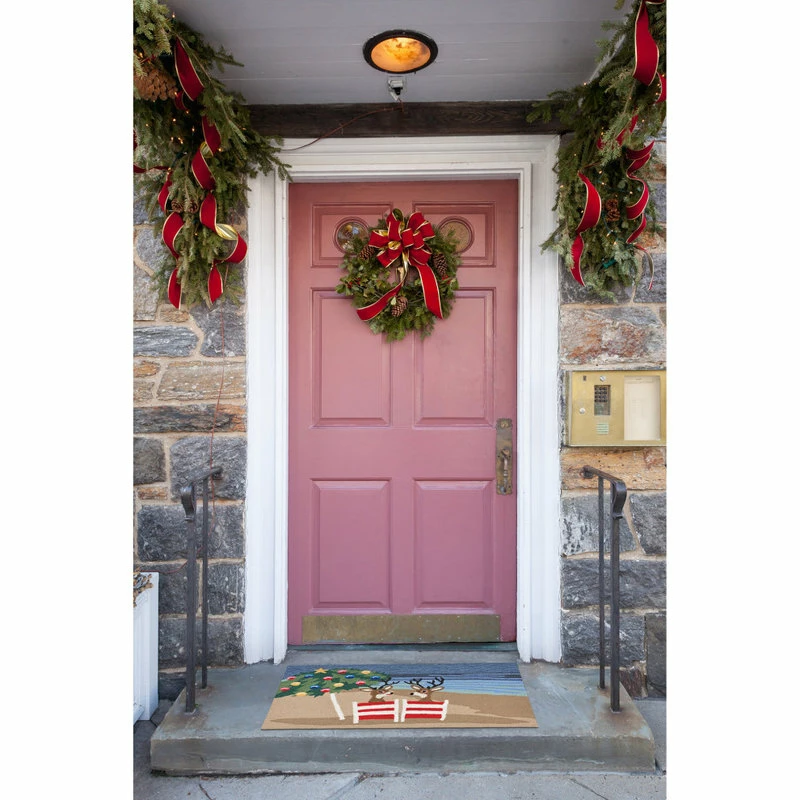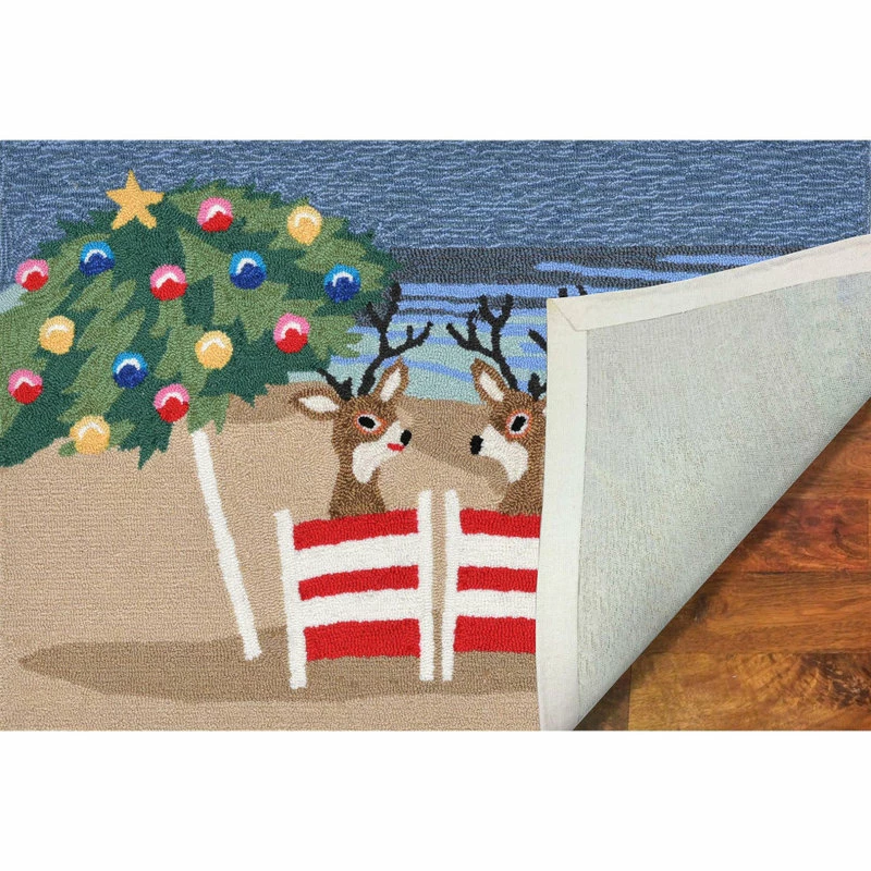 Christmas is at the beach with two reindeer relaxing in the sand with a holiday decorated umbrella. Featuring bright hues of blue, green, red, white and tan that bring this playful scene to life. This happy scene makes this mat the perfect accent to welcome guests at your door, at your kitchen sink, or in any space inside or outside your home. Made in China from a polyester/acrylic blend, the Frontporch Collection is hand tufted to create detailed designs with intricately blended colors for a high-quality finish. The material is hand hooked to create both softness and durability with weather resistant and added fade resistant treatment that is remarkably easy to clean. These pieces are perfect for you patio, entryway, bathroom, laundry room and kitchen making this the ideal indoor or outdoor rug. Fun, casual and unique these vibrant, crisp and detailed patterns range from coastal, farmhouse, novelty sayings, pets and traditional designs to perfectly accent your home. Limiting exposure to rain, moisture and direct sun will prolong rug life.