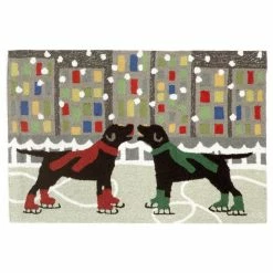 Two dogs get into the holiday spirit with green and red scarves and matching ice skates in this whimsical wintery scene. This happy scene makes this mat the perfect accent to welcome guests at your door, at your kitchen sink, or in any space inside or outside your home. Made in China from a polyester/acrylic blend, the Frontporch Collection is hand tufted to create detailed designs with intricately blended colors for a high-quality finish. The material is hand hooked to create both softness and durability with weather resistant and added fade resistant treatment that is remarkably easy to clean. These pieces are perfect for you patio, entryway, bathroom, laundry room and kitchen making this the ideal indoor or outdoor rug. Fun, casual and unique these vibrant, crisp and detailed patterns range from coastal, farmhouse, novelty sayings, pets and traditional designs to perfectly accent your home. Limiting exposure to rain, moisture and direct sun will prolong rug life.