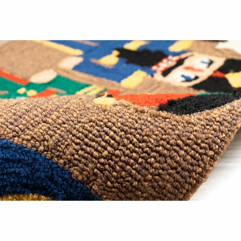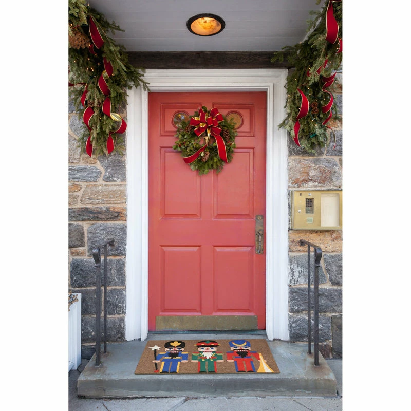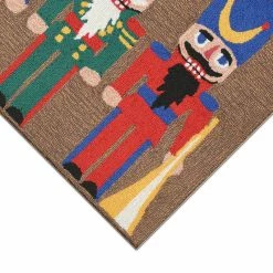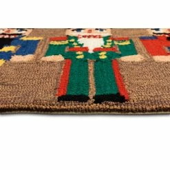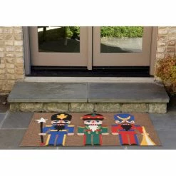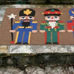 Three colorful nutcrackers stand guard in this holiday mat. Featuring bright colors of blue, black, green and red on a natural background that bring the Christmas spirit to your home. This happy scene makes this mat the perfect accent to welcome guests at your door, at your kitchen sink, or in any space inside or outside your home. Made in China from a polyester/acrylic blend, the Frontporch Collection is hand tufted to create detailed designs with intricately blended colors for a high-quality finish. The material is hand hooked to create both softness and durability with weather resistant and added fade resistant treatment that is remarkably easy to clean. These pieces are perfect for you patio, entryway, bathroom, laundry room and kitchen making this the ideal indoor or outdoor rug. Fun, casual and unique these vibrant, crisp and detailed patterns range from coastal, farmhouse, novelty sayings, pets and traditional designs to perfectly accent your home. Limiting exposure to rain, moisture and direct sun will prolong rug life.