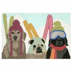 This mat features three dogs ready to hit the mountain skiing. Created with bright hues of light blue, pink, green, black and tan that bring this humorous scene to life. This happy scene makes this mat the perfect accent to welcome guests at your door, at your kitchen sink, or in any space inside or outside your home. Made in China from a polyester/acrylic blend, the Frontporch Collection is hand tufted to create detailed designs with intricately blended colors for a high-quality finish. The material is hand hooked to create both softness and durability with weather resistant and added fade resistant treatment that is remarkably easy to clean. These pieces are perfect for you patio, entryway, bathroom, laundry room and kitchen making this the ideal indoor or outdoor rug. Fun, casual and unique these vibrant, crisp and detailed patterns range from coastal, farmhouse, novelty sayings, pets and traditional designs to perfectly accent your home. Limiting exposure to rain, moisture and direct sun will prolong rug life.