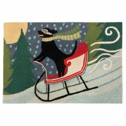 This hand hooked mat features a black dog joyfully sledding down a snowy mountain. Created with saturated hues of blue, green, red and white that bring this playful scene to life. This happy scene makes this mat the perfect accent to welcome guests at your door, at your kitchen sink, or in any space inside or outside your home. Made in China from a polyester/acrylic blend, the Frontporch Collection is hand tufted to create detailed designs with intricately blended colors for a high-quality finish. The material is hand hooked to create both softness and durability with weather resistant and added fade resistant treatment that is remarkably easy to clean. These pieces are perfect for you patio, entryway, bathroom, laundry room and kitchen making this the ideal indoor or outdoor rug. Fun, casual and unique these vibrant, crisp and detailed patterns range from coastal, farmhouse, novelty sayings, pets and traditional designs to perfectly accent your home. Limiting exposure to rain, moisture and direct sun will prolong rug life.