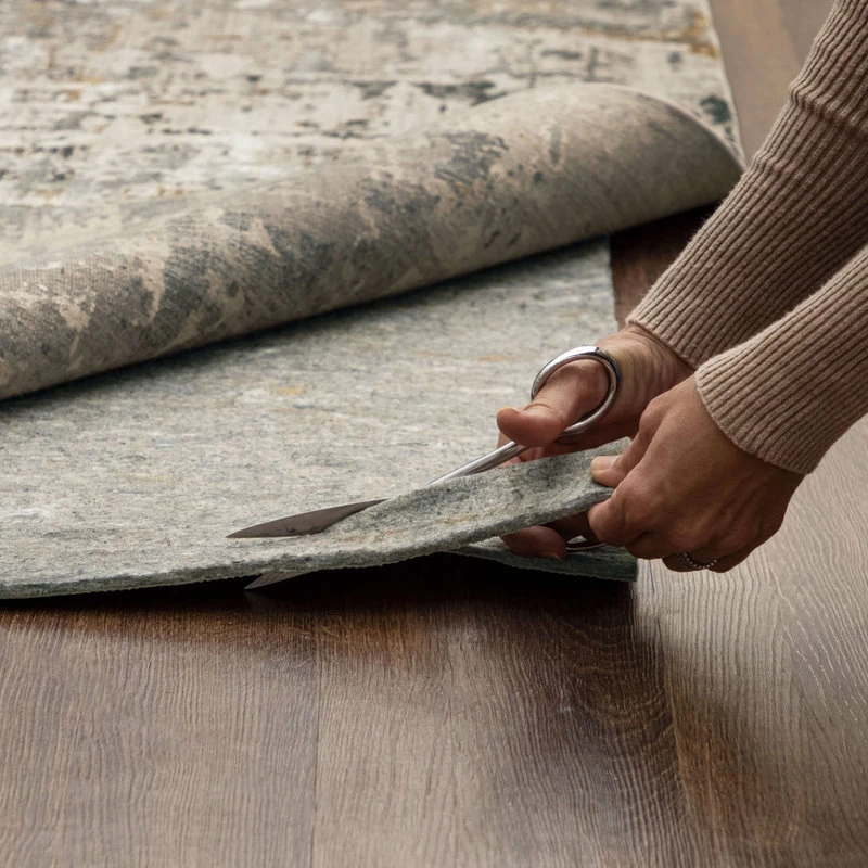 You’ve found the perfect area rug to tie your ensemble together, but before you roll it out, be sure to set down this premium dual surface non-slip rug pad first! Crafted from felt, polypropylene, and rubber materials, this rug pad is built to last and features plush cushioning to give your rug a softer feel underfoot with sound and shock absorbing properties. Essential for all floor types, simply place the latex side of the pad against the floor for hard surfaces and place the felt side of the pad against the floor for soft surfaces. Easily cut to fit any area rug size and give your rugs and floors extended life and cushioning in any busy household.
