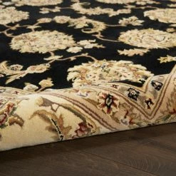 Nourison’s signature handmade rug collection features traditional Persian and European designs, recreated in the luxurious texture of 100% New Zealand wool highlighted with subtle accents of pure silk. These extraordinary carpets are offered in a wide assortment of shapes and sizes, including elegant rounds, high fashion ovals and, of course, a full assortment of standard area sizes and runners. Specially developed hand tufting techniques create a high-density pile that defines a new standard of beauty and sensual appeal for handmade carpets. Antique elegance is replicated in this charming adaptation of a Persian traditional area rug. Lush flower heads and leafy vines spread out in playful symmetry across a ground of shimmering black bordered by pale beige and ivory a regally appealing palette.